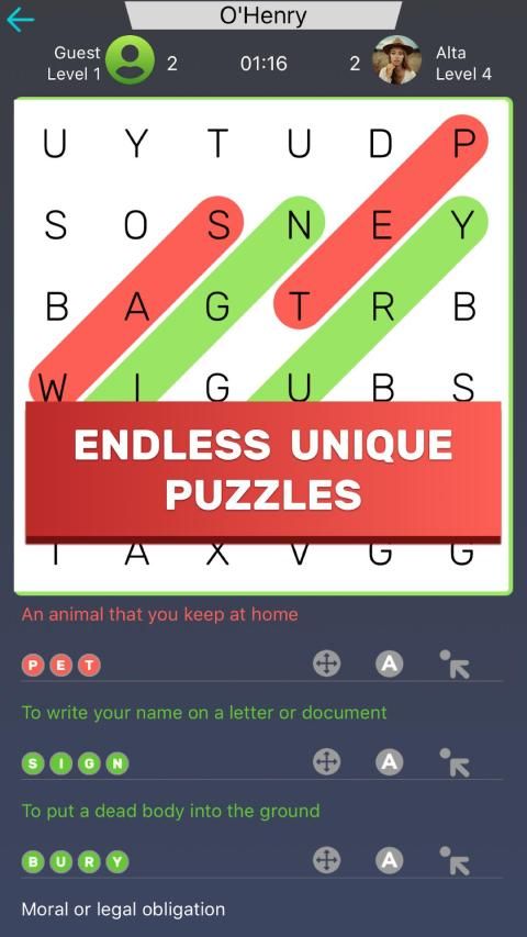 - Clash against friends and foes in multiplayer word search Challenge Mode