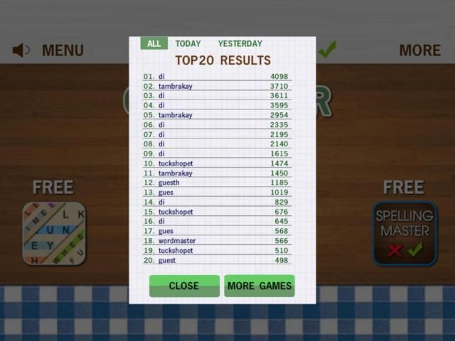 ✓ Jangka waktu - Batas waktu 150 detik, setiap kata yang dibuat dari 4 huruf atau lebih akan menambah detik tambahan