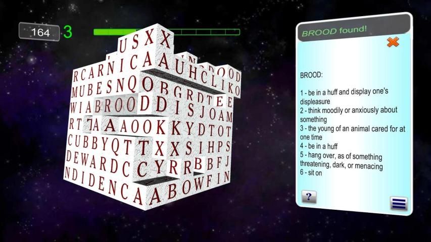 Word Search Cubes mengambil kata pencarian ke dimensi berikutnya. Semua kata yang tersembunyi di sebuah kubus 3 dimensi, dan setiap kali Anda menemukan kata huruf lenyap dan kubus semakin kecil. Ketika semua kata telah ditemukan, kubus hilang! Untuk menemukan kata-kata, Anda berputar kubus sekitar, kemudian pilih huruf - jika Anda benar, kata akan hilang. Anda mencetak poin untuk menemukan kata-kata dengan cepat, dan untuk menemukan kata-kata bonus. Bila Anda menemukan sebuah kata, Anda dapat melihat definisi, cara yang bagus untuk membangun keterampilan kosakata. Kata Cube cocok untuk segala usia, dan dengan 4 permainan untuk memilih dari Anda dapat menyesuaikan kemampuan Anda untuk permainan.