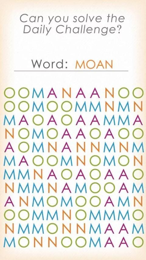 SEARCH: Tidak seperti game pencarian kata lain, Anda hanya perlu menemukan satu kata per puzzle. Bagian yang menyenangkan adalah huruf dalam teka-teki hanya dari kata! (Jika kata tersebut ROOM, maka teka-teki akan dibuat dari O R dan M) Cari, berkonsentrasi, merasa dalam garis lurus dan beralih ke teka-teki berikutnya.