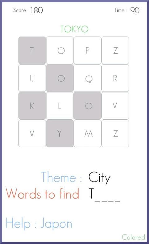Menemukan kata-kata tersembunyi di teka-teki. Kata-kata dalam kotak horizontal, vertikal atau diagonal. Aplikasi ini sangat cocok untuk anak-anak dan orang dewasa. Sebuah permainan yang sempurna untuk menghabiskan waktu.