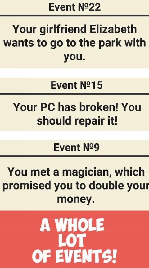 Peristiwa -Random: Anda dapat pergi berbelanja dan sengaja kehilangan uang Anda, atau Anda mungkin mendapatkan dirampok, atau Anda dapat menemukan beberapa uang. Dan ada banyak seluruh peristiwa acak yang berbeda di luar sana!