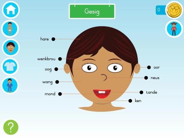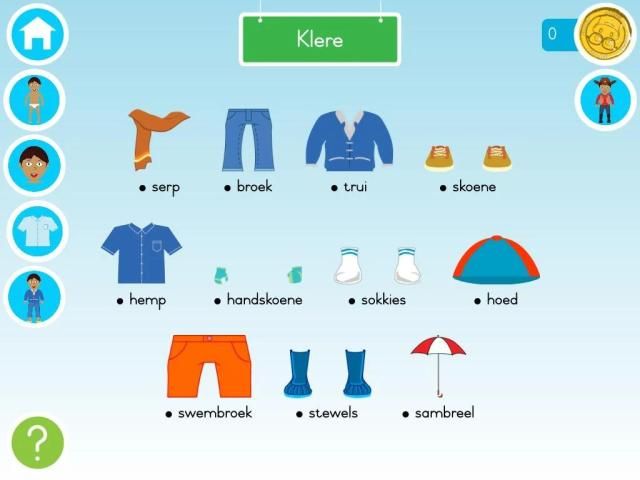 Afrikaans Wardrobe is an Afrikaans educational app for young children that teaches them the names (and pronunciation) for different body parts, clothing and weather.