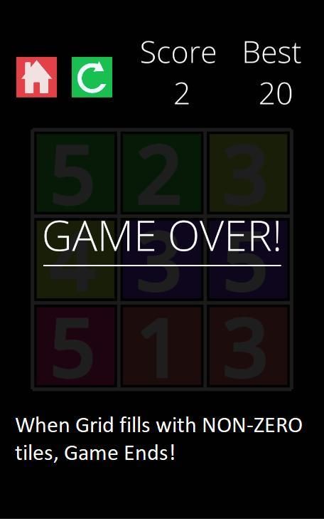 Anda harus mengubah setiap angka menjadi nol dengan menggesek ubin (Atas, Bawah, Kiri atau Kanan). Saat Anda menggesek ubin, angka akan dikurangi satu. Anda mendapatkan satu poin untuk setiap konversi angka NOL. Jadi, tujuannya adalah untuk mengubah angka maksimum menjadi nol.