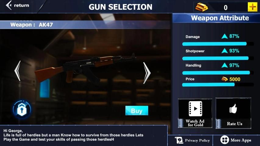Gun store with new and latest weapons .weapons models has also being enhanced to look better. There are a lot of weapons in gun store user can unlock them using coins. If users have not enough coins then user can buy any weapons with real currency.