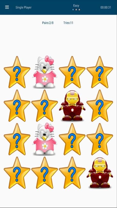 jika Anda memilih Player1 atau pemain 2 diperlukan untuk memanfaatkan kartu (pahlawan super atau hewan) dan perlu menghafal apa yang ada di balik itu dalam rangka untuk mencocokkan pasangan nya.