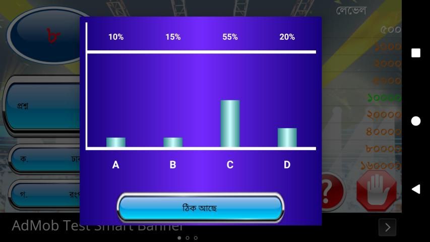 KBC game is made on the concept of the famous game show "ke hobe kotipati". In this game, you get a mock environment of the game. you can get help removing two wrong answer to answer by clicking 50:50. at first, you have to given target to fulfill. if you can exceed the target points then you can get that target points as your score. you can store your result by your name. if you want to exit from the game you can store your game result as your score. It is helpful to increase your general knowledge and will help you to prepare for any examination where general knowledge requires.