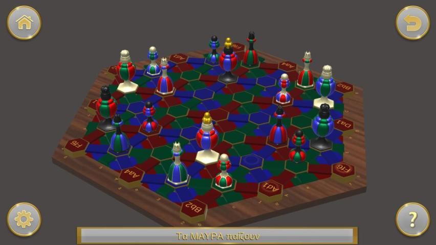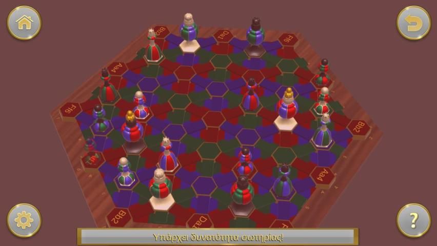 Delapan belas potongan, sembilan untuk setiap pemain, ditempatkan di tengah dashboard tiga dimensi dan bergerak di koridor dengan maksud untuk membuat keluar dari permainan Raja Ches lawan.