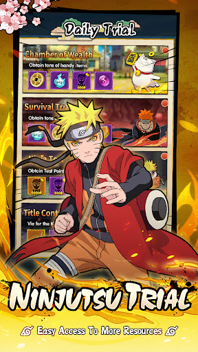 Berpartisipasi dalam persidangan ninja setiap hari untuk mendapatkan banyak sumber daya termasuk koin tembaga, exp, ninja langka, dan sebagainya.Sumber Daya Limpahan sangat mempercepat pelatihan Anda!
