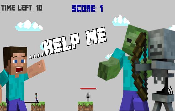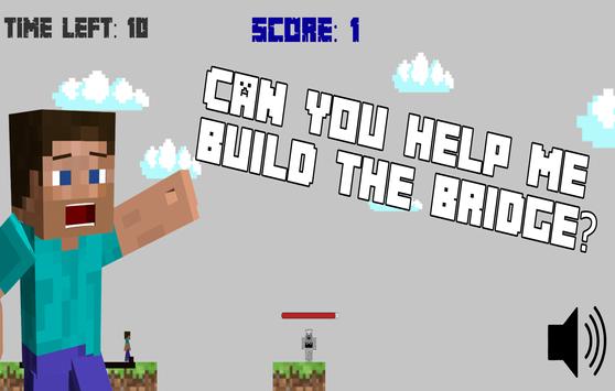 Minecraft Bridge Builder is a game about constructing bridges to get to the next checkpoint, aka block, featuring itself as an endless runner. There's obstacles in the form of skeletons and zombies, that will make your path harder, or even stop you in your tracks from achieving a great score! Survive as long as you can, but don't take too long, or you'll run out of time!