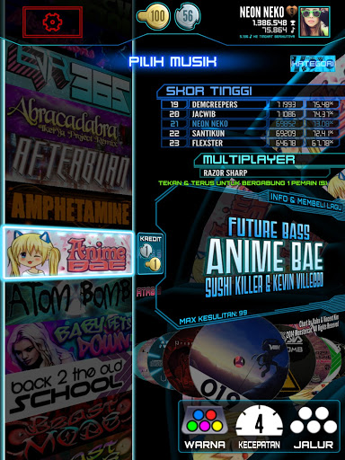Benar-benar menyesuaikan your pengalaman with Litani pilihan: mengubah kecepatan permainan, menyusut ukuran catatan, bertukar warna, balikkan layar, semacam perpustakaan musik besar dengan kriteria yang berbeda, dan banyak lagi.