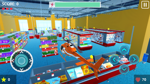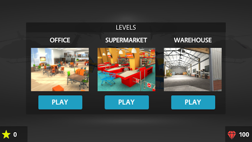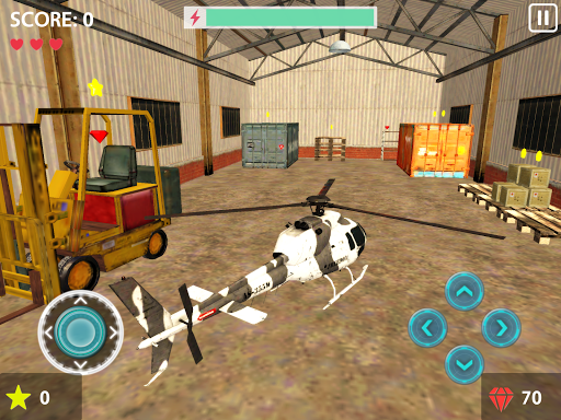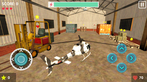 Helikopter Terbang Remote Terkendali dan Mengumpulkan Bintang Di Tiga Tempat Berbeda: Kantor, Supermarket dan Gudang.