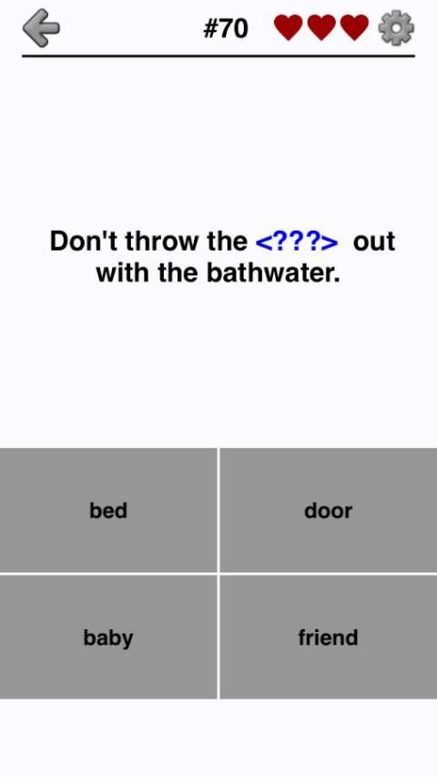 Menebak kata yang hilang dan menyelesaikan 200 peribahasa dan idiom bahasa Inggris, seperti: “Sebuah *** sehari menjauhkan Anda dari dokter” atau “Jauhkan teman dekat dan Anda *** dekat”.