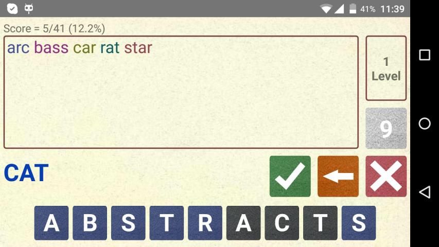 The goal of the game "Words in a Word" is to make as many words as possible from given words. At each level it is possible to make more than ten words and more than hundred words at the higher ones. To move to the next level, you have to make a minimum number of words that are shown on the right side of the game screen. It will be indicated the total number of guessed words at each level on the level screen. All results of the game are saved.