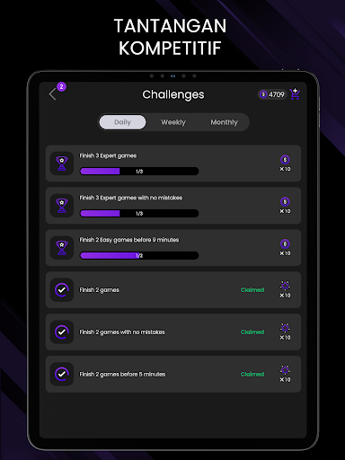 - Tantangan harian / mingguan dan bulanan yang umum terjadi pada game matematika, suduko , game kenken, game mr logic , game kalkulus, game numpuz , nonogram number kuiz , number match game , game woodoku , game blockudoku , game blok , game fokus dan game berpikir - Selesaikan tantangan logika dan kumpulkan piala