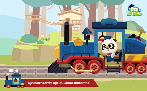 Semua naik Kereta Api Dr. Panda! Antarkan penumpang ke kursi mereka dan naikkan muatan untuk memulai perjalananmu. Saat kamu mulai meninggalkan stasiun, bantulah Dr. Panda mengemudikan kereta api, atau sapalah temanmu di gerbong penumpang untuk melubangi karcis mereka dan menyajikan kudapan! "