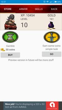 free loot (simple task), Character armor preview, skills tab (in future), achievements (in progress), damage scaling formulas (in progress), level up dialog (in progress), armor customization (in progress);