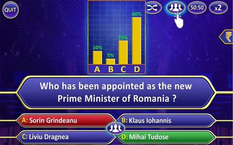 Dalam kehidupan ini penonton baris akan memberikan jawaban untuk pertanyaan saat ini dengan dalam 10 detik Anda akan mendapatkan hasil dalam persentase yang bijaksana untuk semua 4 jawaban.