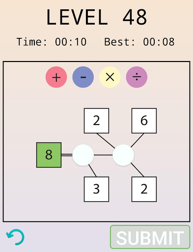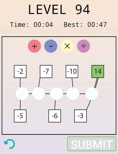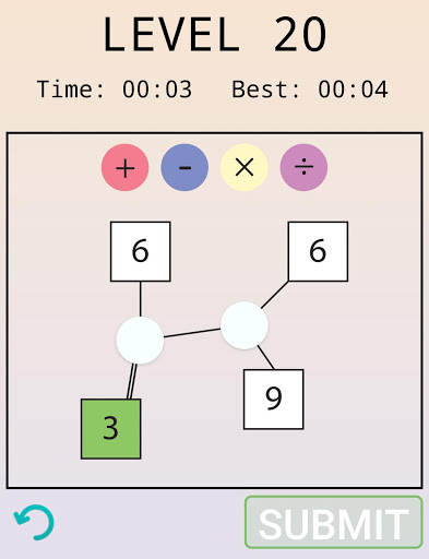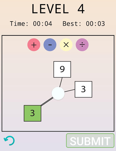 Select the correct operators (plus, minus, divide, multiplication) for each open circle to get the right answer.