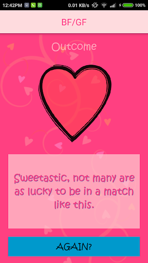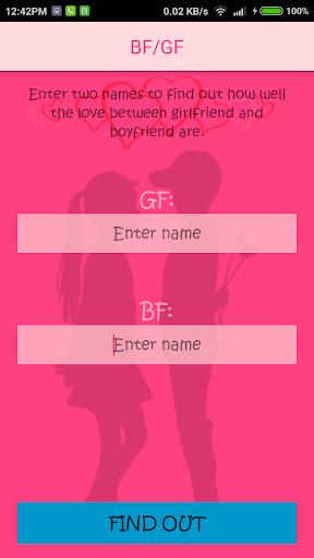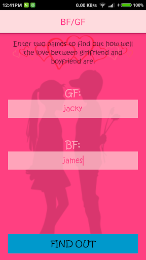 Play the ultimate Boyfriend/Girlfriend (BF/GF) test game. Enter the name of the two loved ones and find out what it has to say about this relationships phase of love. Feel free to try it out on others you know such as your friends or their friends and beyond.