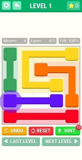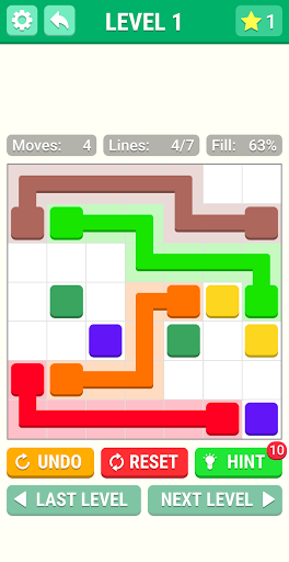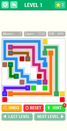 Connect the dots of the same color. Connect all pairs, and cover the entire board to solve each level. Be careful when you draw a flow, not to cross other flows, or they will be cut! If you get stuck, hints can help you out.