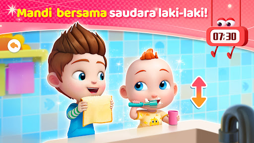 Pagi! Kakak dan adik sudah mulai menyikat gigi. Sekarang giliranmu untuk ajari JoJo cara menyikat gigi dan mencuci muka. Semua selesai. Hari yang indah bersama keluarga JoJo telah dimulai!