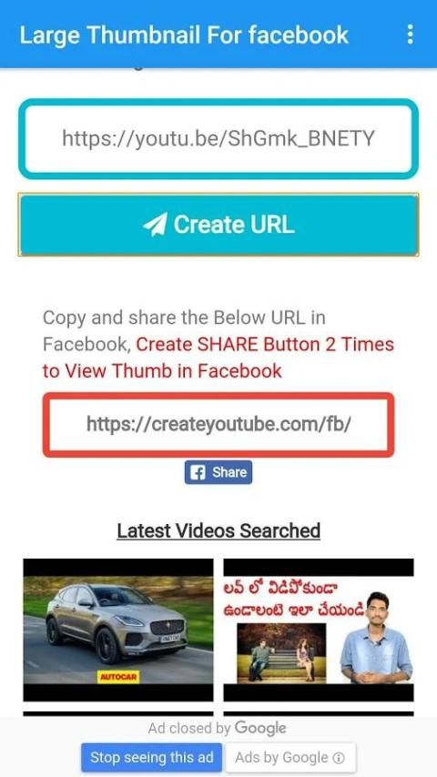 Dengan bantuan aplikasi ini Anda dapat membuat thumbnail youtube besar untuk fcebook. Hanya menyalin URL video dan paste di bagian Url dari aplikasi ini dan klik membuat link. Hanya menyalin link yang Anda akan mendapatkan dan paste di dinding facebook Anda.