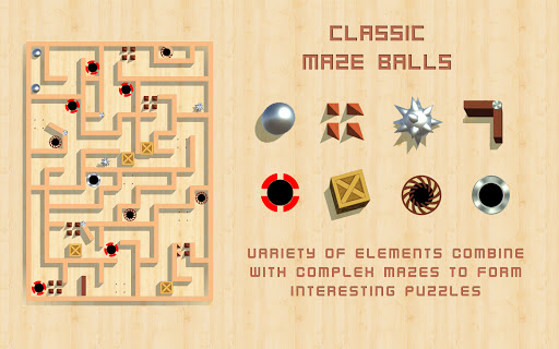 Permainan ini hadir dalam gaya bingkai kayu klasik dengan bola besi yang bergulir berdasarkan gerakan smartphone atau joypad. Anda bisa merasakan pengalaman labirin berbasis papan kayu asli di ponsel cerdas Anda. Game ini membawa pengalaman utama dari versi retro kembali.
