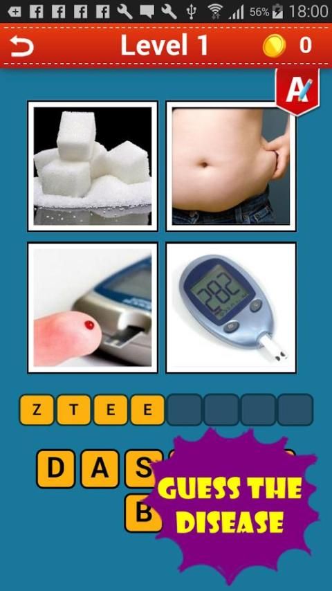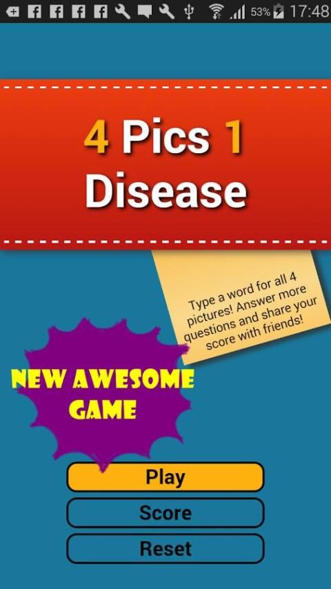Ini adalah jenis lain dari 4 Pics permainan, menggunakan 1 kata dalam hal ini akan menjadi penyakit atau gejala menebak, menggunakan penyakit atau sindrom Anda kosakata dan mencoba menerka setiap gangguan yang disajikan dalam mengagumkan 4 Pics 1 Penyakit kata ini dan teka-teki permainan.