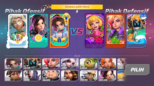Battle seru menantimu! Dalam mode ini, 6 hero bersaing satu sama lain. Pemain yang lebih dulu menyelesaikan 12 KO akan menang!