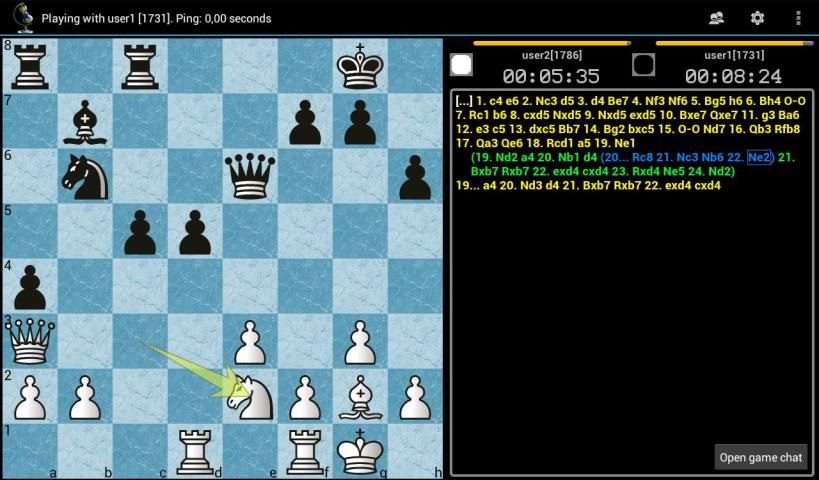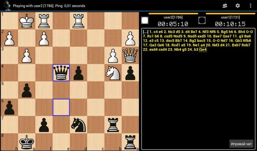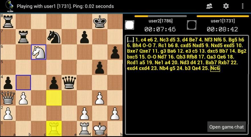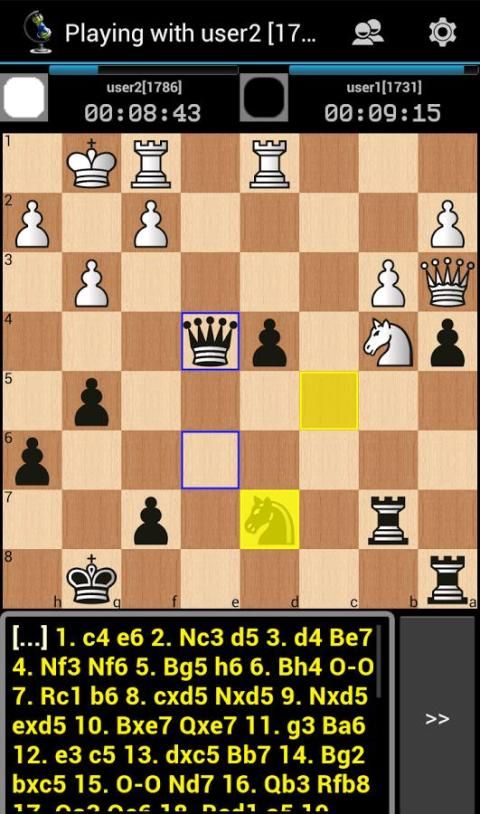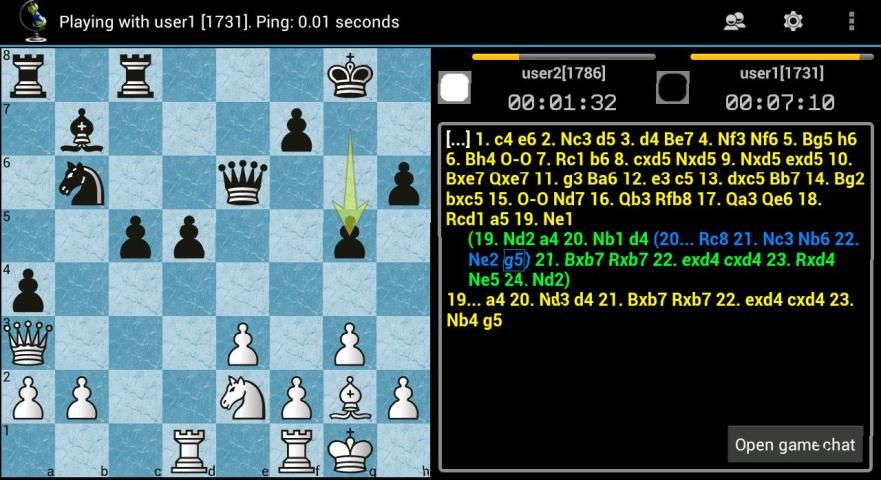 Anda bisa bermain catur online dari ponsel, tablet atau PC. Permainan disimpan dalam database lokal dalam standar PGN. permainan disimpan dapat dibagi melalui email, skype atau jabber. Anda dapat bermain catur secara lokal, online atau menonton pertandingan catur hidup. Game online adalah mungkin tanpa pendaftaran, tetapi jika mendaftar, Anda akan mendapatkan rating catur pribadi Anda untuk kontrol tiga kali - peluru, blitz dan standar.