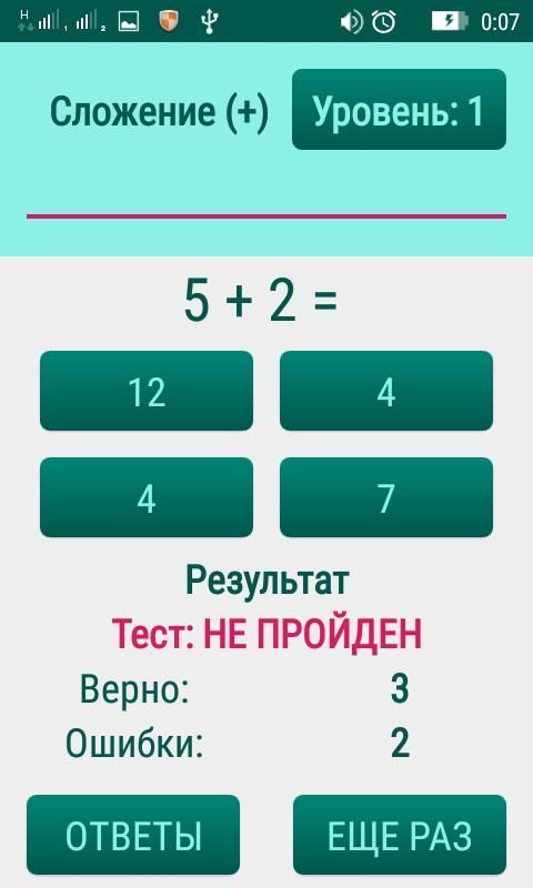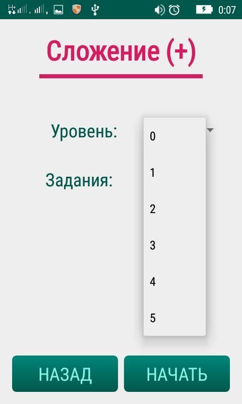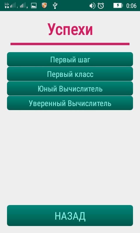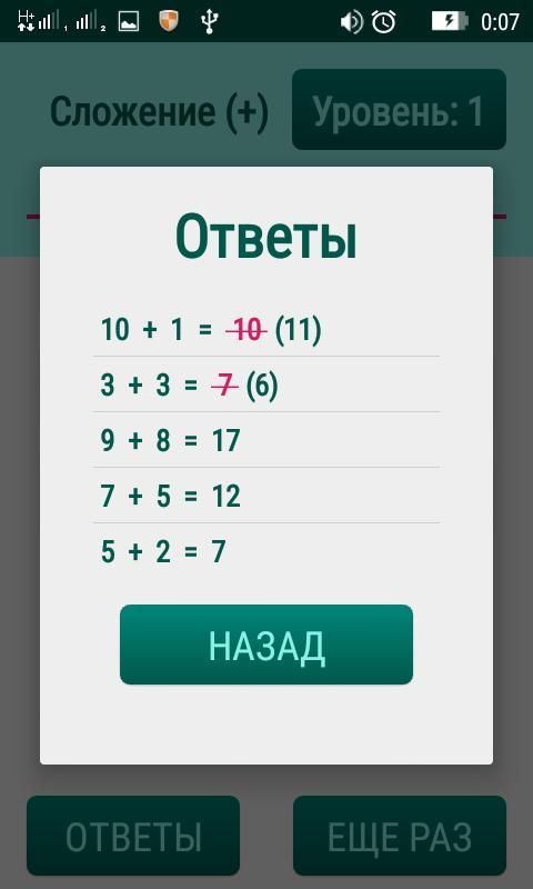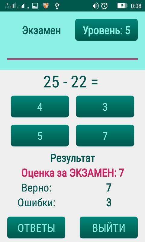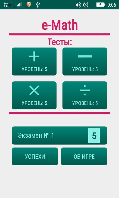 * Доступны категории Сложение, Разность, Умножение, Деление и Экзамены.