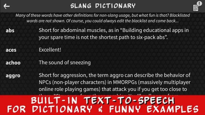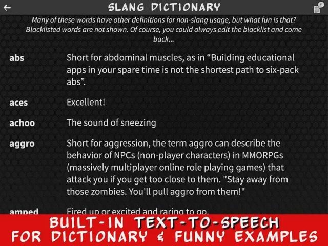 Dengan lebih dari 250 kata slang dari seluruh dunia, pasti ada beberapa kata atau penggunaan yang baru bagi siswa Anda yang lebih tua atau bahkan Anda. Jangan khawatir! Kamus slang lidah-di-pipi dibangun ke dalam aplikasi dengan fungsi text-to-speech berguna untuk membaca definisi dengan suara keras.