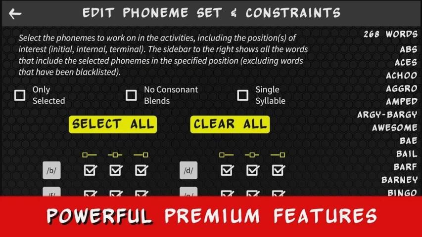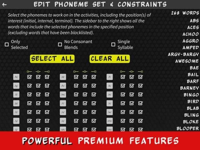 Dengan fitur Editor, Anda dapat menyempurnakan fonem yang diminta oleh peserta didik untuk mengidentifikasi dan membedakan. Ingin berlatih hanya dengan konsonan kata awal? Suara vokal pendek? Kecualikan campuran konsonan? Hanya menggunakan kata-kata tunggal? Semuanya mudah dengan Editor.