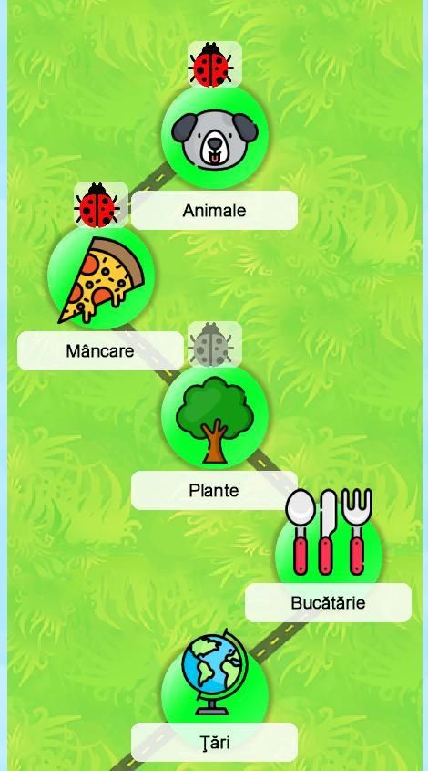 Categoriile sunt: plante, animale, țări, mâncare, bucătărie.