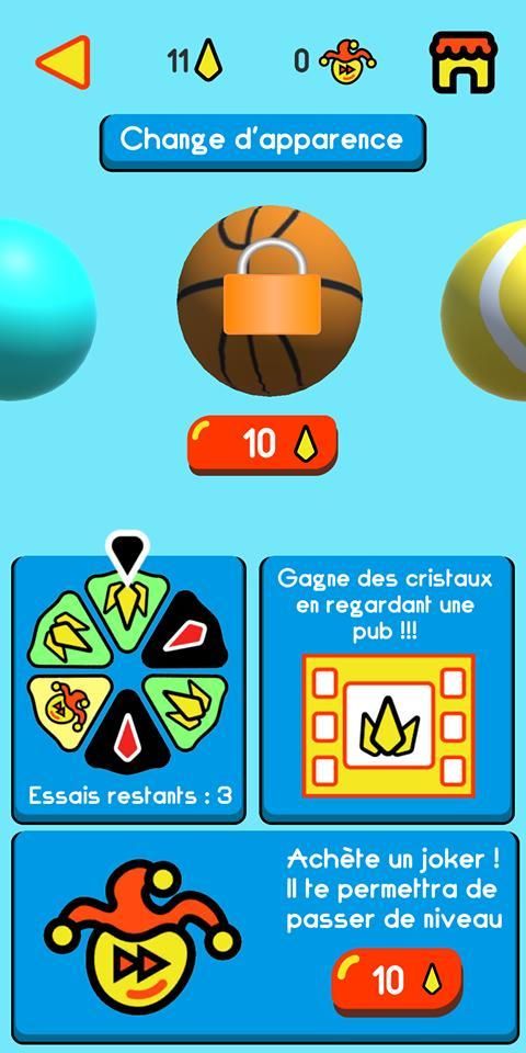 Aide la boule à récupérer ses cristaux !!! Grace à un joystick, tu peux déplacer ou pivoter des éléments de la scène pour faire rouler une boule jusqu'à son objectif qui te fera passer au niveau supérieur ! C'est plus dur que ça en a l'air ! Il faut avoir beaucoup d'adresse et d'habileté ! Sur chaque niveaux tu peux récupérer des cristaux qui te permettront de débloquer des apparences de balle.