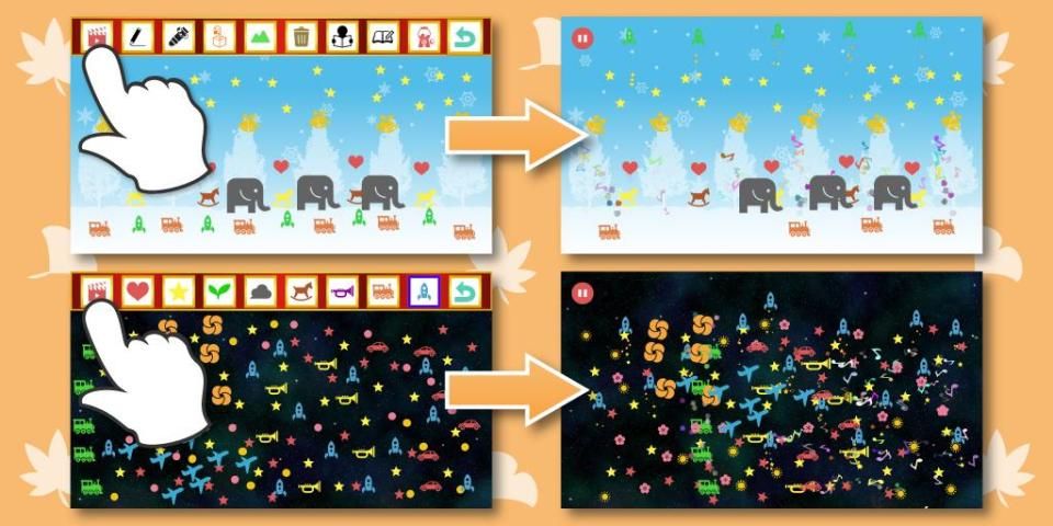 白いホワイトボードだけではなく、黒板や宇宙などのいろいろな背景があるので好きなものを選んで遊びましょう!