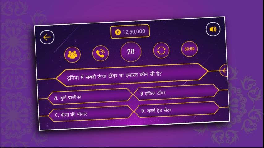 Kami akan mengajukan pertanyaan dari Sejarah India, film-film Bollywood, peristiwa terkini dan semua bidang lainnya seperti olahraga, mitologi, astrologi, astronomi, geografi, dan biologi. Game KBC KBC ini akan membantu siswa yang sedang mempersiapkan ujian kompetitif seperti IAS, IPS, GPSC (Komisi Layanan Publik Gujarat), UPSC (Komisi Layanan Publik Uni), dan ujian SSC, Ujian Bank atau Petugas PO.