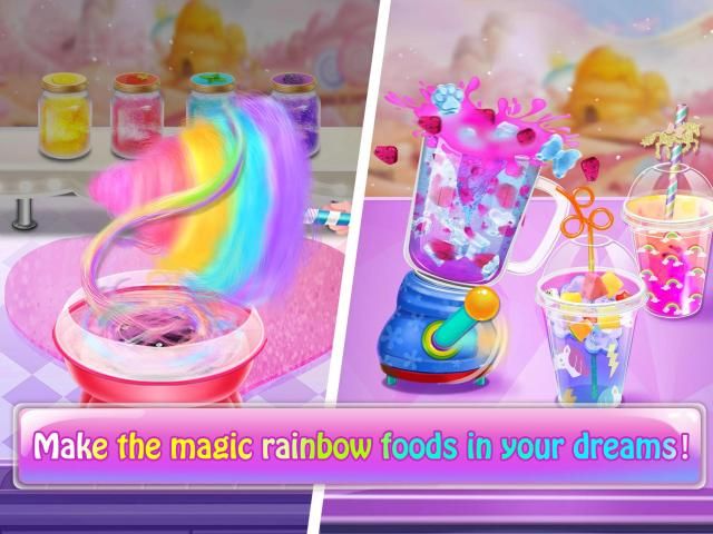 Pergi bepergian ke tanah sihir pelangi untuk menjelajahi makanan unicorn pelangi lezat! Seperti keju panggang pelangi, permen kapas unicorn, gulungan es krim, tongkat marshmallow, dan latte pelangi yang fantastis!