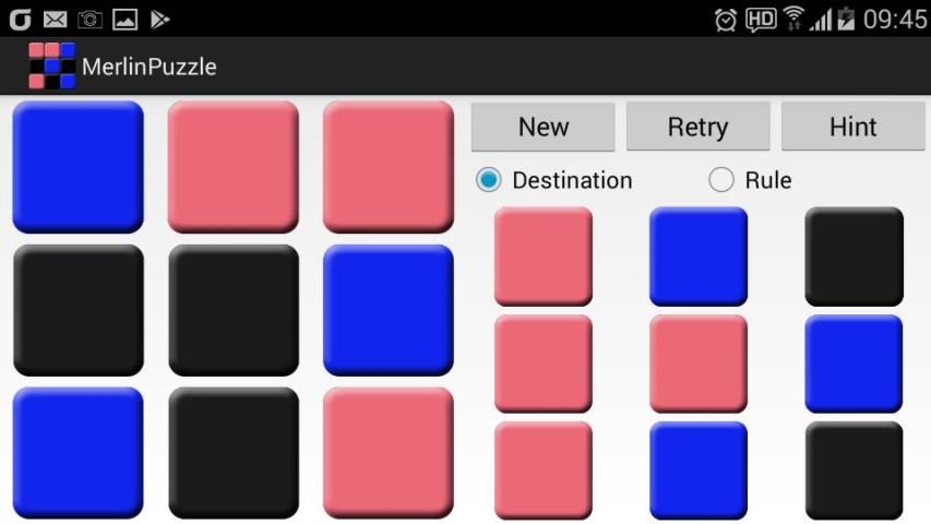 Merlin permainan adalah untuk menciptakan sebuah permainan puzzle ditempatkan di warna yang sama dengan kartu sasaran wajah-bawah bersama dengan sembilan kartu diatur dalam 3x3 untuk bermain ditentukan.