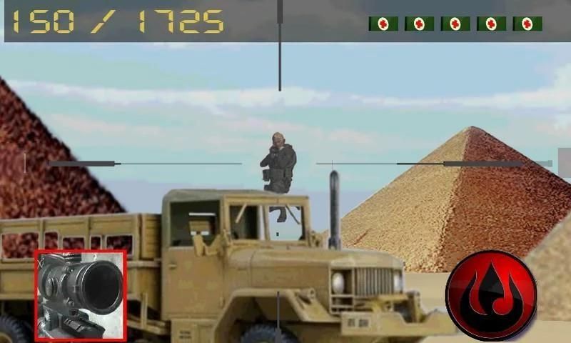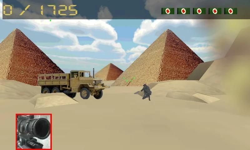 The area of the pyramids is in danger. You are the best army sniper and you have been called to end the terror. Immerse yourself in battle and how many enemies you kill. It is a war against terror. Use the accelerometer to aim, your smart phone is transformed into a sniper scope.