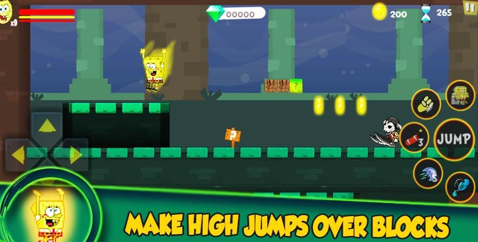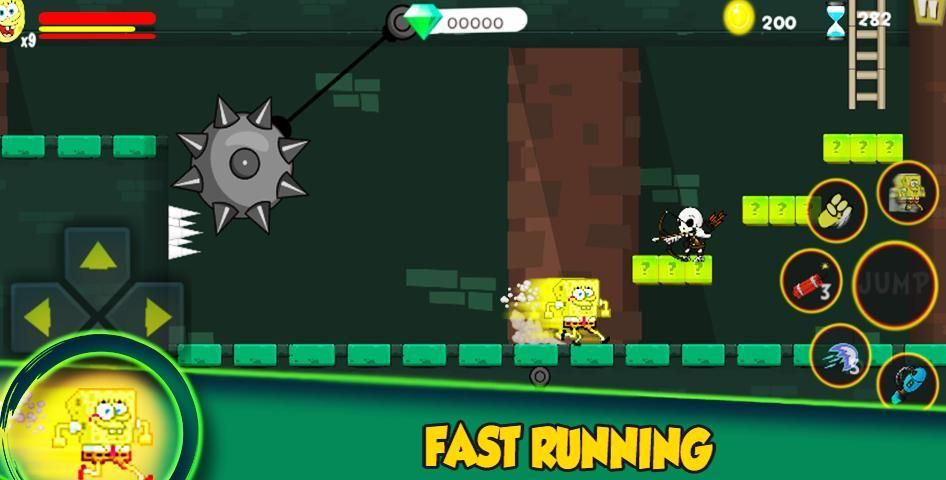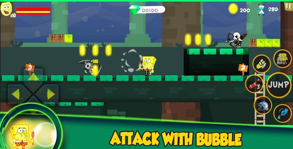 Untuk melengkapi spongebob platformer pengalihan yang super hop Spongesshould dan menjaga spongebob berjalan Bob lebih banyak rintangan, pertempuran dan menembak melawan ninja chibi bintang laut, biadab Patrick hiu, naga, tengkorak, bajak laut, perangkap, kucing dan Snail banyak squarepants binatang yang berbeda dan kelelawar mitos Spons petualangan