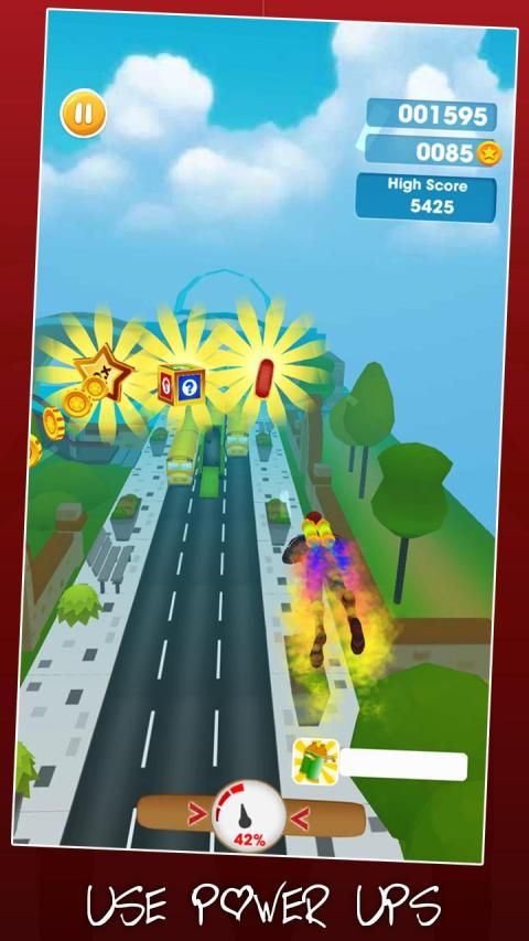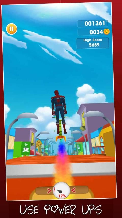 It is very easy to control the power spider, run miles as fast as you can, rush in the unlimited city scene. Be careful to avoid carrier, collect more and more coins and buy more props. There are many hero characters to choose, cat, unicorn and dog. Every amazing spider runner have unique style. Take your liked pet to get the first runner.