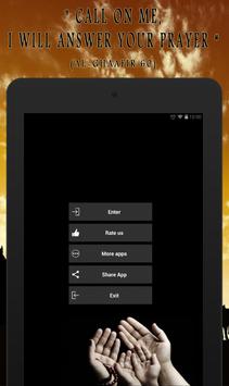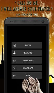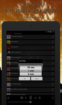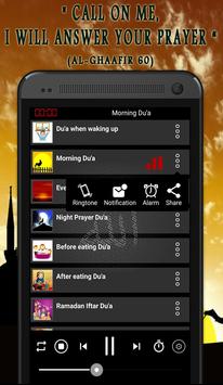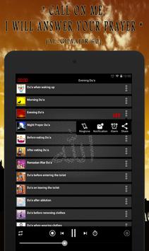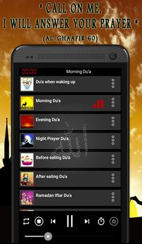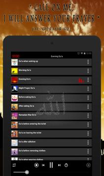 L'applicazione include le preghiere per tutte le occasioni, per loro recitare al mattino dopo il risveglio, per la sera, per pregare la sera, prima di mangiare, dopo aver mangiato, la rottura del digiuno del Ramadan (durante Douas a dire il Ramadan), entrando in bagno, Duaa dopo abluzioni, togliere gli abiti, o indossarli, entrando in casa, fuori di casa, dopo la Athan, moschea entreant o gita di esso, dopo istikharah salat, del viaggio, della pioggia, visitare le tombe, prima della recita del il Corano, duae a chiedere perdono, doa Qunoot ,, do3aa alleviare le preoccupazioni, dua'a protegge da incubi prima di andare a dormire, il Diker per cuore si rilassa da Shaikh Sudais recitazione, la preghiera del venerdì per Sheikh Sudais anche.