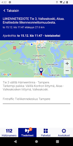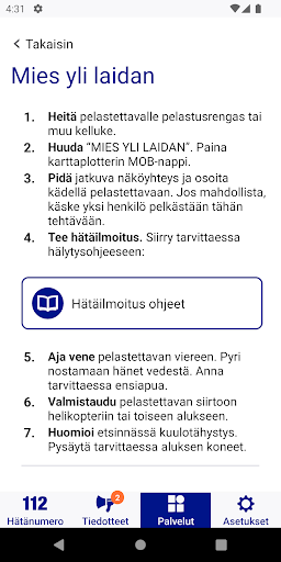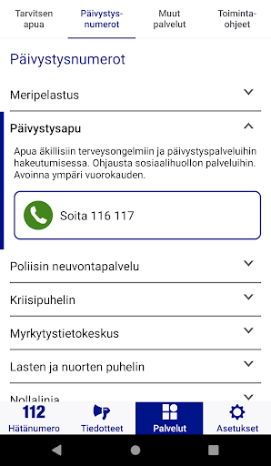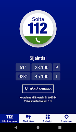 112 Finlandia è un'applicazione mobile per il centro di risposta alle emergenze ed è stata sviluppata in collaborazione con attori della sicurezza finlandese.Il suo scopo è che un utente trovi il servizio di cui hanno bisogno in situazioni di emergenza e problema. > Le informazioni sulla posizione vengono trasmesse automaticamente alla chiamata di emergenza quando si chiama una domanda di chiamata di emergenza tramite.