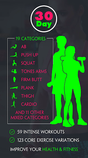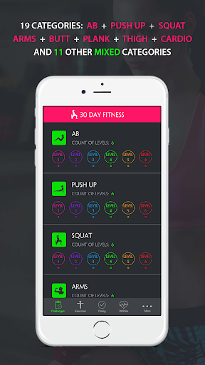 ► 19 workout categories: Ab, Push Up, Squat, Toned Arms, Firm Butt, Plank, Thigh Slimming, Cardio, Leg, Back, Chest, Burpee, Beach Body, Crunch, Tricep Dip, Sit Up, Wall Sit, Lunge and Little Black Dress.