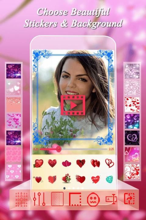 Movie video editor app create a video in slide show style with your photos, music and animation with several steps, selecting beautiful Love photos, adding new filters and music, text, theme, effects, frames and stickers, instantly finish your own video.