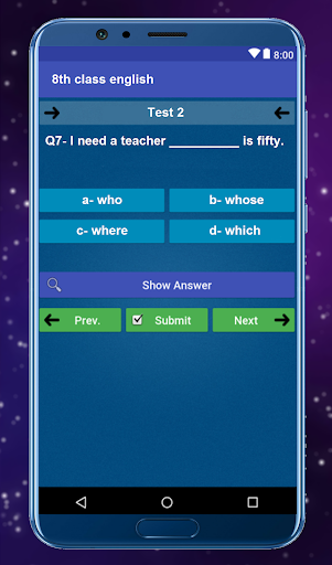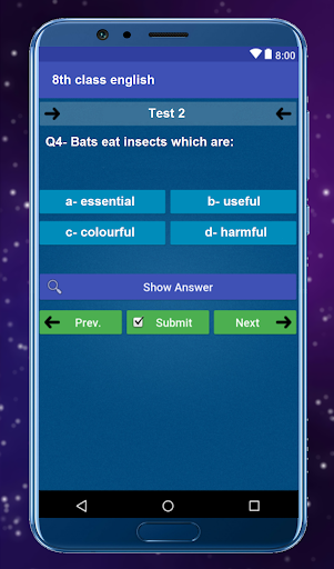 If you are student of 8th class or any other person who wants to improve his knowledge of english then this app is specially designed for you! This app contains dozens of Mcqs taken from 8th class english notes and 8th class english book. It is very useful app for students who are studying in eigth grade and wants to gain concept of