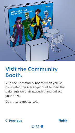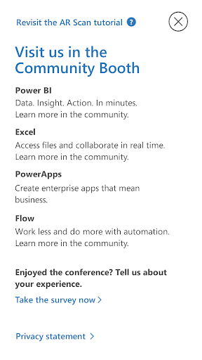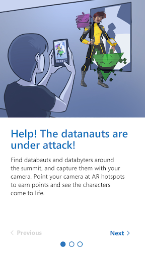 Combining the real-life conference experience with an app-based AR experience, the AR Conference Scavenger Hunt challenges users to find product-based posters and printed hotspots hidden around a conference. Posters and hotspots are located at keynotes, partner booths, and breakout sessions. Scanning a poster or hotspot provides an AR experience, and allows the user to earn points. Point totals are saved to a Power BI Dashboard that allows users to see their progress compared to the other attendees.