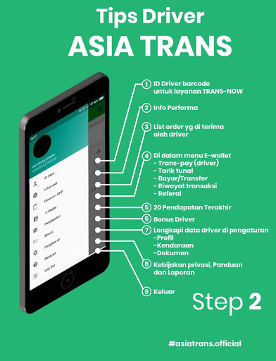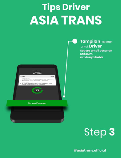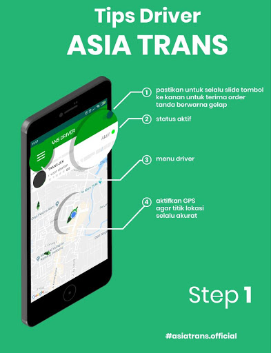 > Registrazione dei partner sul sito Web; www.asiatrans.id. Crea una password e memorizza la tua password. Dopo aver registrato con successo il sito Web, scaricare l'applicazione Asian Trans Driver da Playstore e immettere utilizzando il numero di cellphone che hai registrato e la password sul sito web. Assicurati che la tua applicazione sia sempre attiva (il pulsante giusto scivolando in verde scuro) per connettersi al cliente. Completa i tuoi dati nell'applicazione Trans Driver. Se una notifica scritta dei dati non è completa, fare clic sull'articolo per scoprire le informazioni sui dati incompleti.